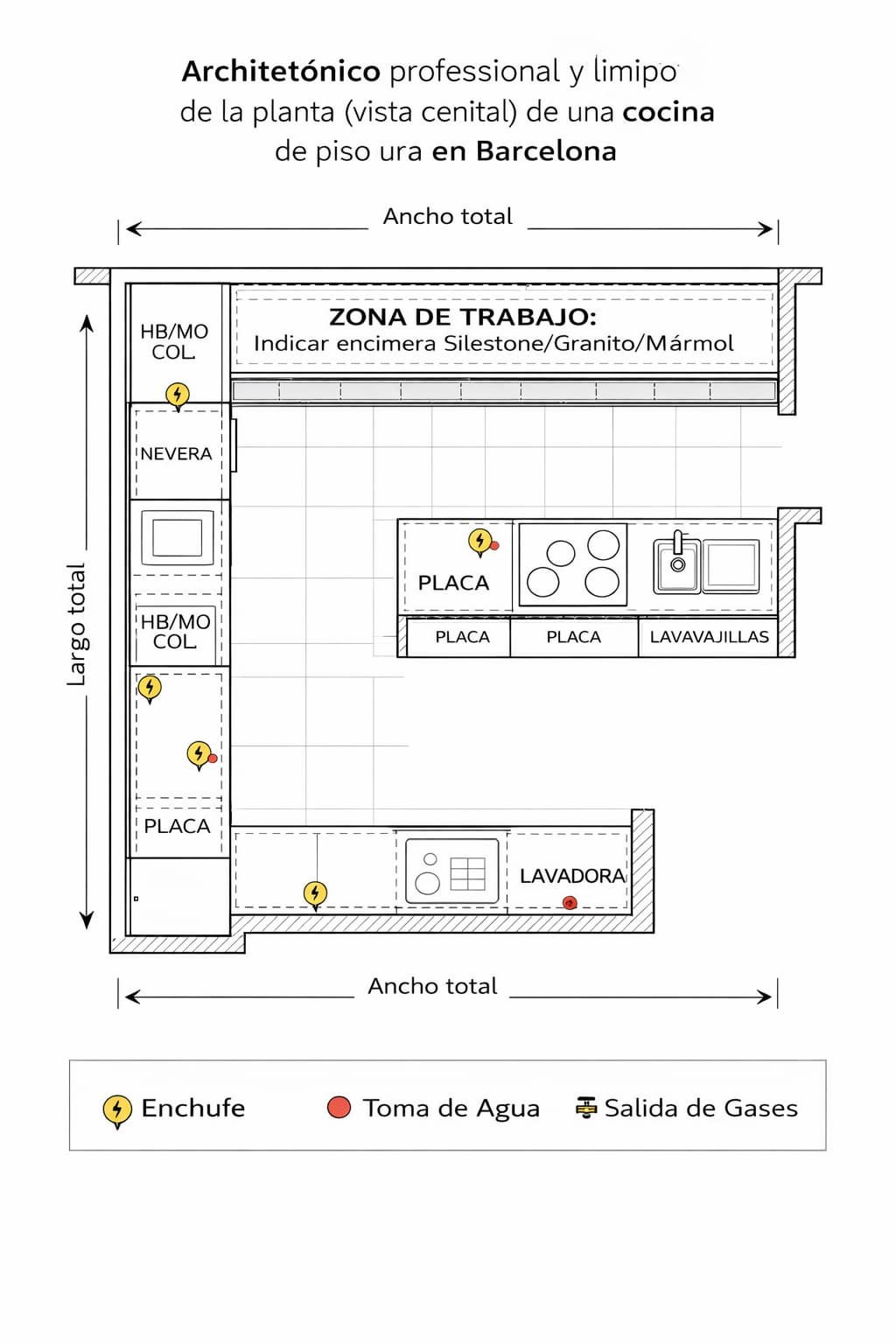 Mapa de puntos clave para reformar tu cocina: ubicación de electrodomésticos, tomas de agua y enchufes. “🔍 Haz clic en la imagen para ver el plano en detalle”