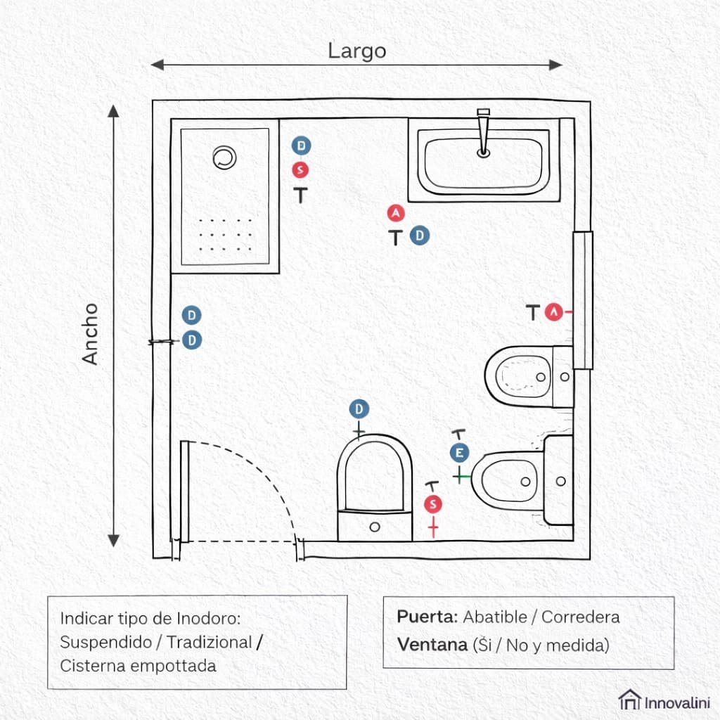 Sigue este croquis para enviarnos las medidas de tu baño por WhatsApp y obtener tu presupuesto gratuito. “🔍 Haz clic en la imagen para ver el plano en detalle”.
